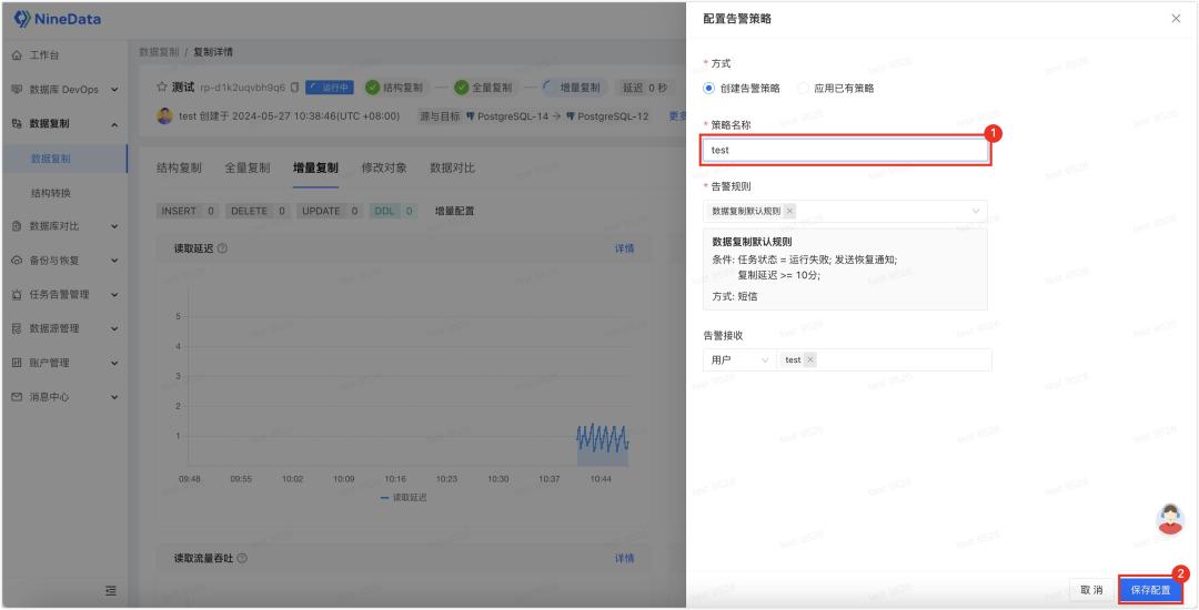 即可。您可以直接使用内置的默认规则,在任务运行失败,或复制延迟大于等于 10 分钟的时候,发送短信提醒您。您也可以自定义创建规则,根据您的需求来进行通知。