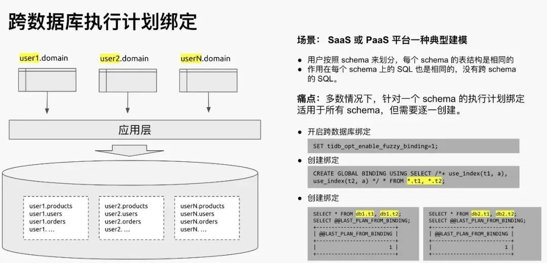 为解决这类问题,TiDB 在 8.1.0 中支持创建跨数据库执行计划绑定(cross-db binding)。一个执行计划绑定能够匹配到只有 Schema 不同的多个 SQL 语句,大幅简化了在这类建模下的 SQL 调优工作。