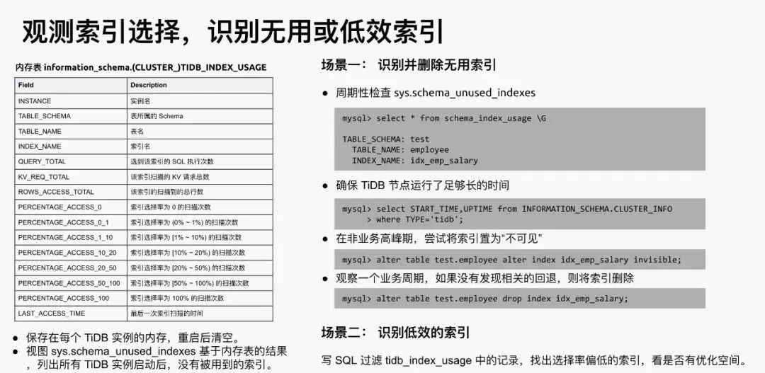 TiDB 在最新的 LTS 版本中引入了对索引使用情况的监控功能。通过内存表 TIDB_INDEX_USAGE 记录了每个索引自实例启动以来的运行情况,包括索引被选择的次数、扫描行数以及每次扫描时的选择率范围等信息。这些数据可以帮助管理员确定哪些索引是活跃的,哪些索引的选择效率偏低,从而帮助识别出需要删除的索引和有优化空间的索引。为了符合 MySQL 用户的使用习惯,TiDB 还提供了 sys.schema_unused_indexes 视图,快速查看自实例启动以来未被使用的索引。