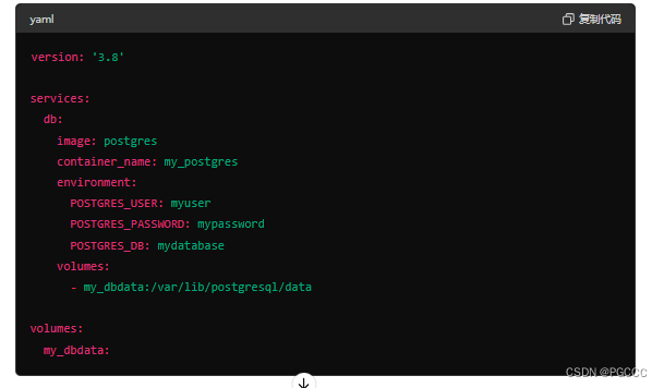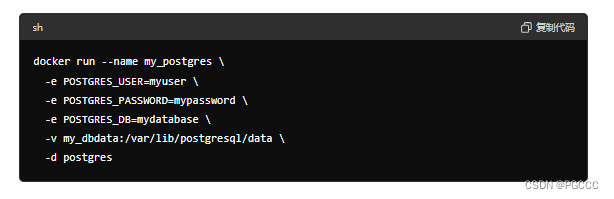 -v my_dbdata:/var/lib/postgresql/data:将主机上的 my_dbdata 卷挂载到容器中的 /var/lib/postgresql/data 目录。