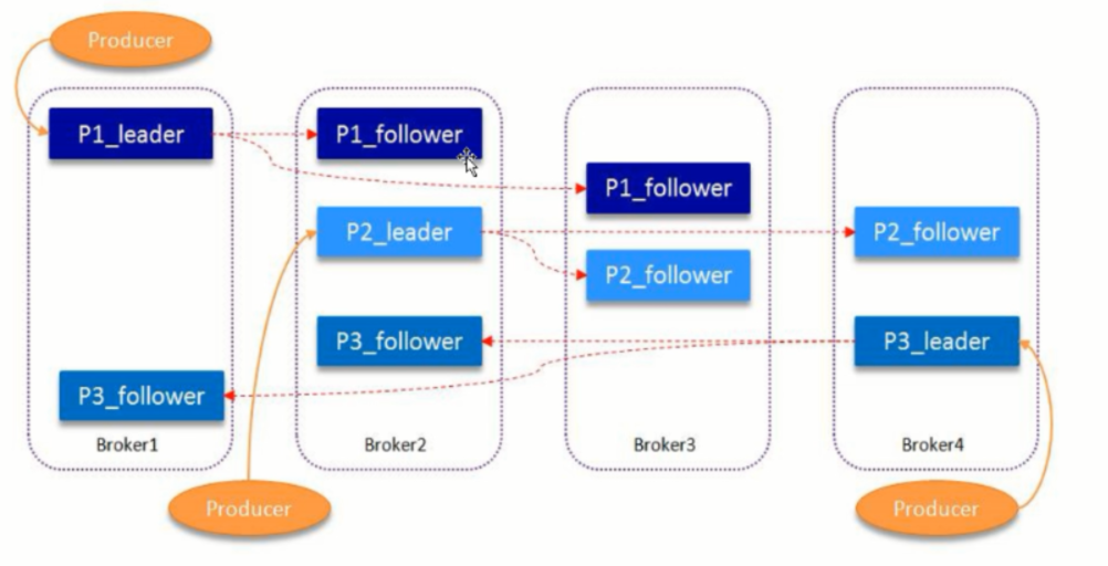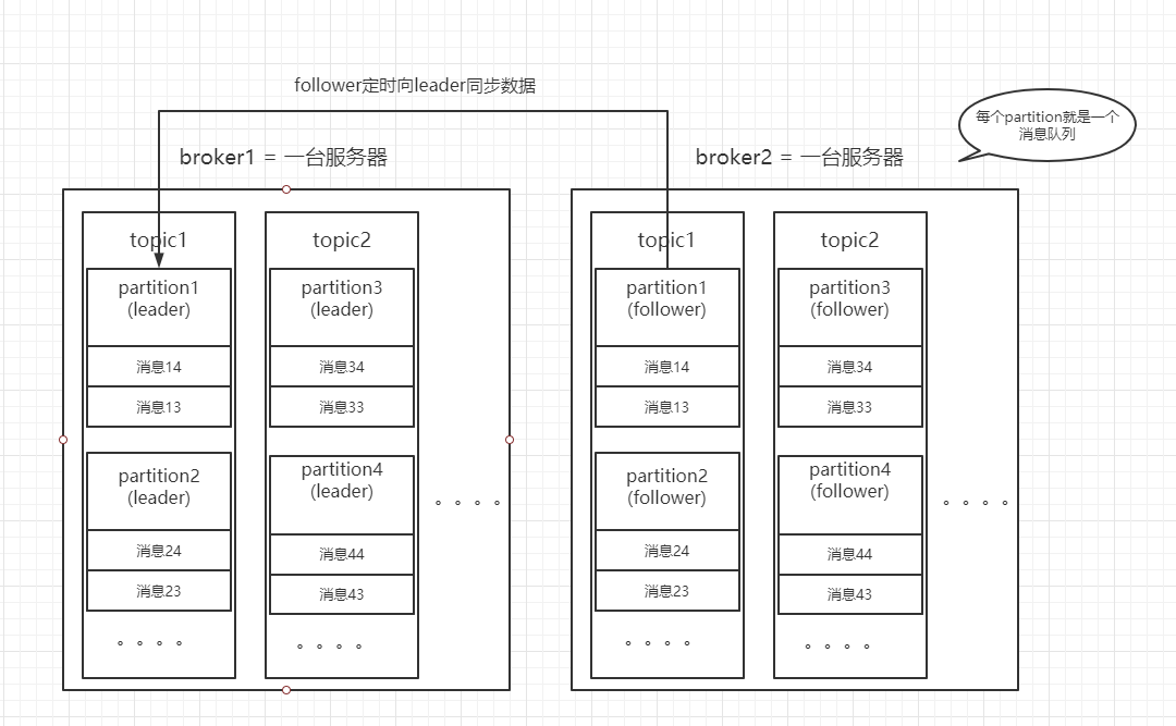 副本,Partition含有N个Replica,其中一个replica为leader,其他为follower;follower定期去同步leader数据;