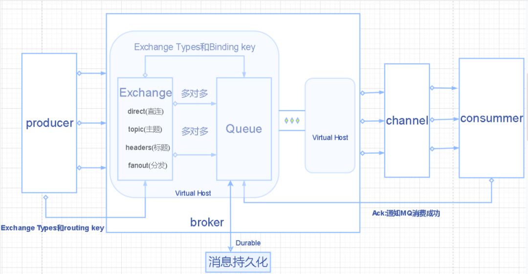 1.Broker:消息队列服务器实体2.vhost:虚拟主机,一个broker里可以有多个vhost,用作不同用户的权限分离3.Exchange:消息交换机,指定消息规则,处理消息和队列之间的关系Exchange Types:direct、topic、fanout、headers4.Queue:消息的载体,每个消息都会被投到一个或多个队列5.Binding:绑定,把exchange和queue按照路由规则绑定起来6.Routing Key:路由关键字,exchange根据这个关键字进行消息投递7.channel:信道,打开信道才能进行通信,一个channel代码一个会话任务,它是真实 TCP 连接之上的虚拟连接8.producer:生产者,投递消息的程序9.consumer:消费者,接受消息的程序