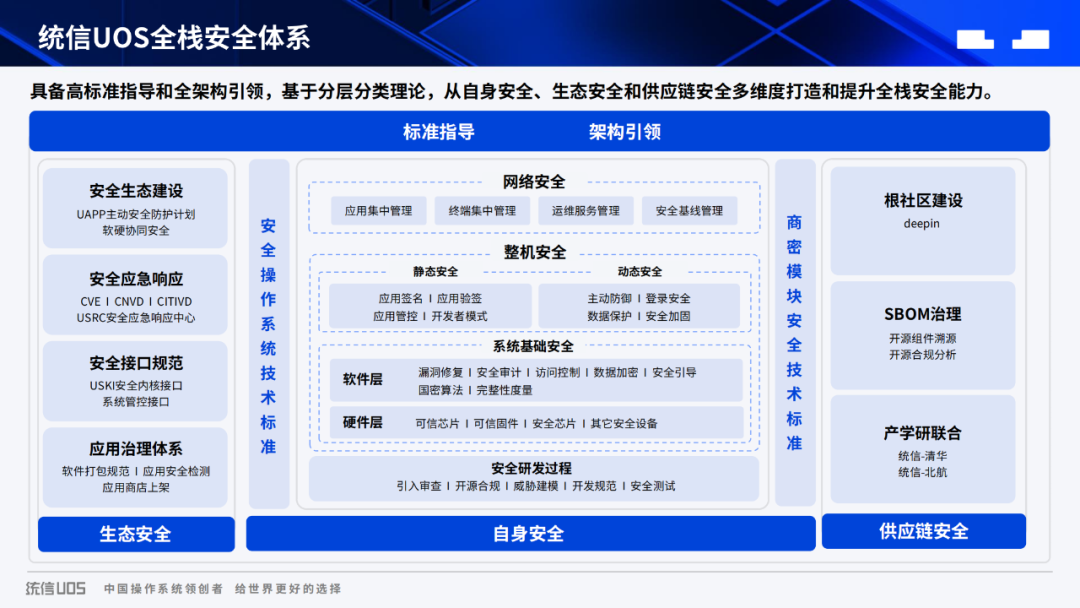 结合操作系统安全四级认证(等保2.0)和可信计算等要求,统信软件以自身安全、生态安全、供应链安全为一体两翼,构建了从芯片到软件、从内核到应用、从主动防御到安全合作的统信UOS全栈系统安全防护体系:
