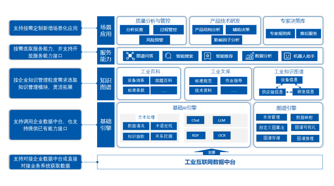途普智能荣获本次奖项,展现了公司在工业互联网的深厚技术底蕴和应用潜力。公司核心产品TopGraph企业知识中台,可提供从基础引擎到知识图谱、服务能力、场景应用的全面解决方案。平台能够无缝对接企业数据中台或业务系统,灵活拓展知识管理模块,支持定制化服务接口,实现场景化应用的快速开发。