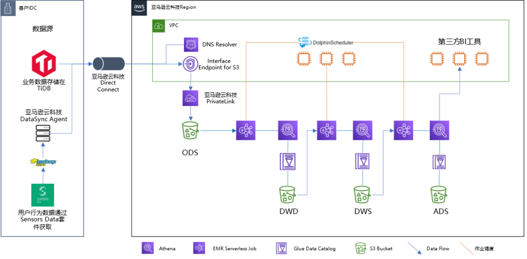 金融科技客户非常关注数据安全和合规性。对于博客中讨论的具体案例,业务数据存储在本地 TiDB 上,而用户行为数据通过Sensors Data套件收集,存储在本地 HDFS 上。TiDB 是亚马逊云科技全球合作伙伴。