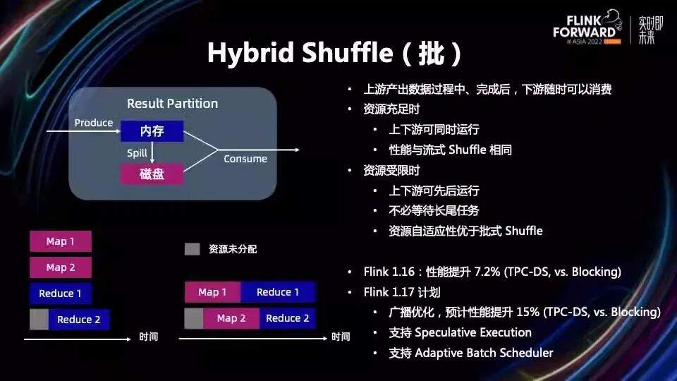 同时社区也在推动 Shuffle 3.0 中提出了 Hybrid Shuffle,Hybrid Shuffle 将流式 Pipeline Shuffle 跟批式 Blocking Shuffle 的特点结合在一起,让用户在写数据时,既可以写入内存通过内存直接进行消费,也可以在内存中存放不下这么多数据、下游消费不够及时的时候,将数据写入到磁盘当中进行后期消费。通过自适应切换,在上游产出数据的过程中和完成后,下游可以随时消费,从而彻底消除资源碎片的情况 [10]。