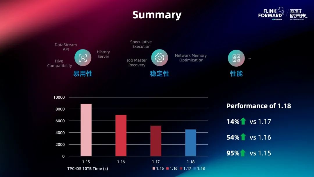 虽然,Flink 流批一体已经达到生产可用的状态,但是社区也看到仍然有不少需要继续投入的地方,例如继续完善 DataStream API batch 的能力,使其能够完全与 DataSet API 能力对齐;更加深入地与 Apache Celeborn 结合,结合 Flink 特点实现动态切换 Shuffle 的机制,多级存储引入内存、支持 Flink Hybird Shuffle 等;更加深入地与 Apache Paimon 对接,整合流批一体引擎和存储的能力,让用户能够更加简单地使用 Apache Flink + Apache Paimon 搭建流批一体的数据湖仓。