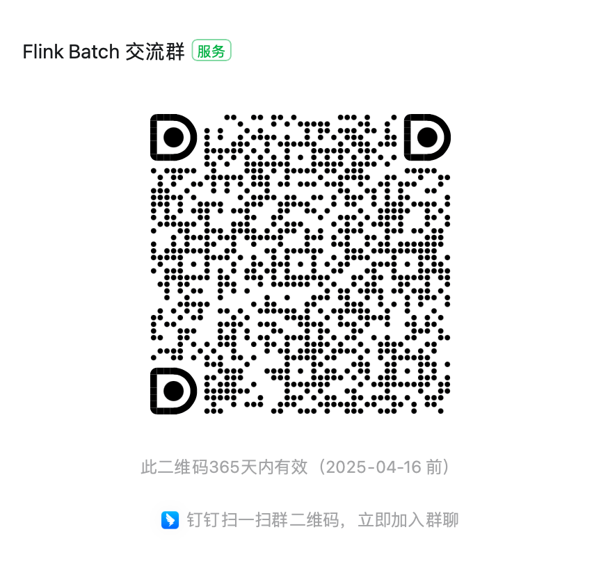 “Flink Batch 交流群”群的钉钉群号:34817520,也可以扫码加入