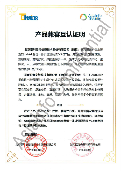 - 亚信安慧AntDB数据库与泰利思诺datArk备份一体机管理系统完成兼容性互认证