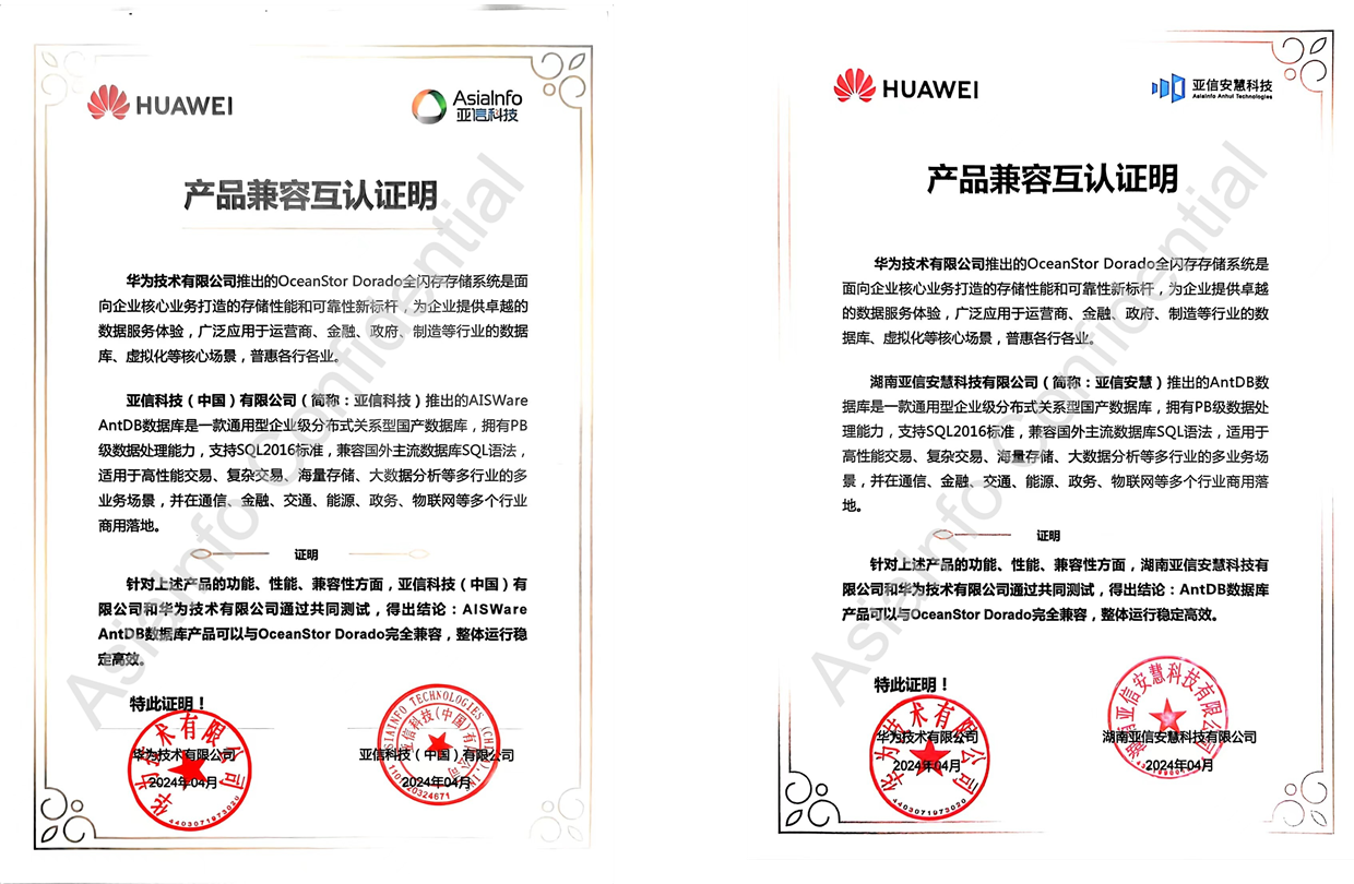 - 亚信安慧AntDB数据库与华为数据存储完成兼容性互认证