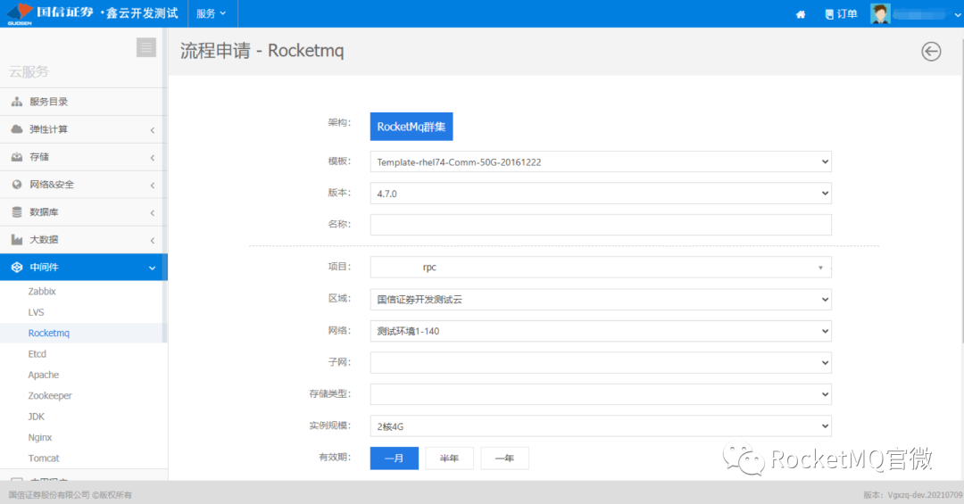 我们知道,如果是通过手工的搭建 RocketMQ,或多或少存在误配置的问题,同时对于 RocketMQ 相关性能调优的经验也难以复用沉淀。为此在基础架构方面,我们在开发测试网段、生产网段都提供了 RocketMQ 的集群自动构建流程,将构建流程自动化。开发或运维可根据需要填入所需的集群信息,待流程审批通过后,平台会自动做集群构建。这样一来可大大减少集群搭建的时间,减少出错概率。