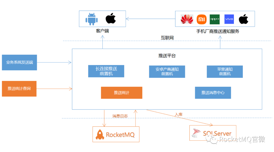 推送平台支撑国信网金、营业部、总部分支机构等业务部门的信息推送,和当前主流手机厂商都做了对接,如苹果、华为、小米和 OV 等,目前日均推送信息数量为 200w。推送平台提供了多维度的统计查询功能,可方便让推送者查询其推送信息的各个状态情况。这样就要求推送平台对消息推送的状态做记录,对每个人的每条消息都要记录推送状态日志,每条消息大概有 10 个状态,那么总计每天日志记录量为 2000w 左右。同时消息推送特点是集中在交易日的开市 9 点到 10 点左右。如果直接采用 JDBC 入库的话,那么会对数据库造成较大的压力,同时也可能影响到消息推送的速度。为了避免上述问题,推送平台使用 RocketMQ 发送推送状态日志,推送统计模块拉取 RocketMQ 推送日志,然后对日志做批量入库。