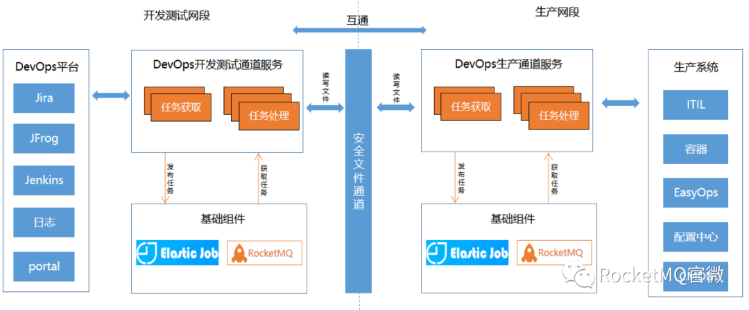 举几个例子:比如“部署与发布管理”中“过程可视化”对上线流程的要求,在开发侧中 Jira 可以自动创建 ITIL(要求开发环境的 Jira 可以通过生产的 ITIL 创建工单),ITIL 里面各类流转信息要在开发侧可见(我们通过回写到 Jira 上线单),对于部署平台比如容器平台,数据库发布平台的日志在开发侧也要可见。第二个是配置的管理,比如配置晋级,微服务的配置要从开发、测试最后一路晋级到生产环境。也要打通到生产。最后和安全组达成一个办法,将两个网段直接的系统调用系统通过公司的安全文件通过来存放。然后两边各部署一套通道服务来定期获取文件,解析并调用对应的系统接口。