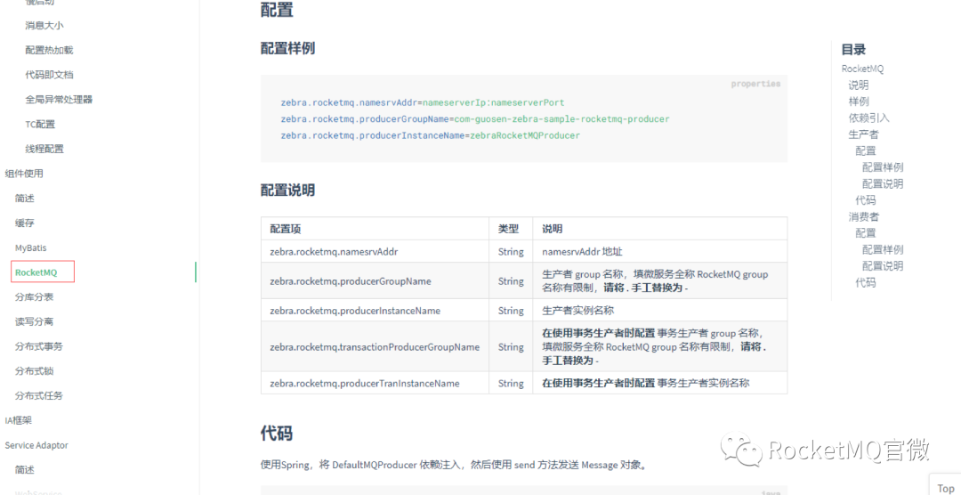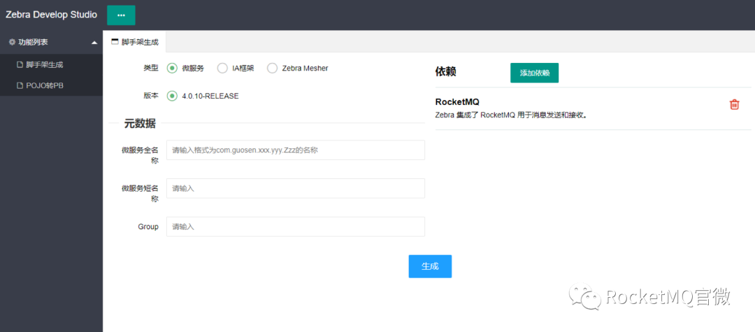 最后再简单看下中台微服务框架对 RocketMQ 的支持,微服务提供了集成 RocketMQ 的文档说明,使用方法等,同时微服务的脚手架也支持可视化引入 RocketMQ 依赖。