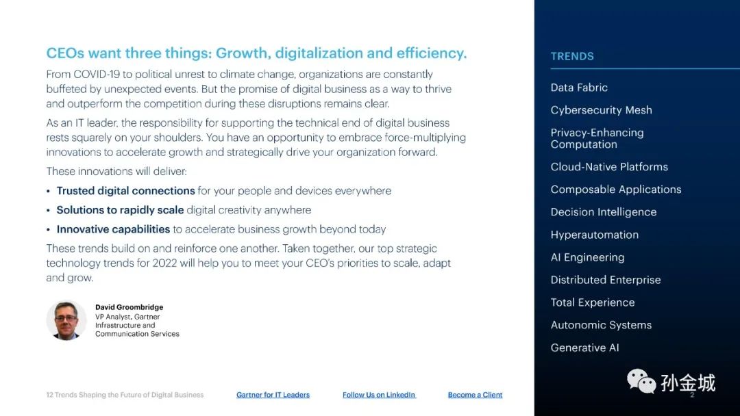 Gartner 的研究报告无疑是我们企业看世界的眼睛,是企业进行商业决策的关键输入。[BE YOUR EYES] 系列的初心也是呼吁更多的朋友关注Gartner的研究报告,大家一起成长:)