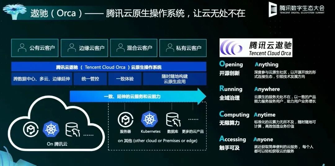 11月3-4日,腾讯数字生态大会现场,腾讯云首次正式对外公布分布式云战略,同时发布行业首家全域治理的云原生操作系统遨驰Orca。腾讯副总裁、云与智慧产业事业群COO兼腾讯云总裁邱跃鹏表示:“腾讯云原生操作系统遨驰单集群支持10万级服务器、百万级容器规模,管理的CPU核数超过1亿,计算正式进入亿级时代。腾讯云将通过分布式云构建无所不在的云服务。”