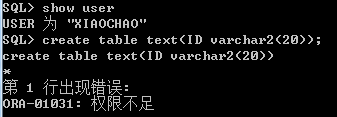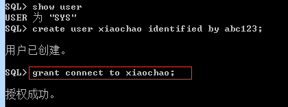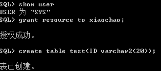 左图可以看出,xiaochao不具有创建表的权限,现在切换到sys用户给其赋予resource角色
