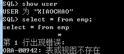 首先同xiaochao登录,执行select * from emp;因为xiaocha用户并没有创建emp表,所以查不到结果集
