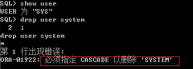 注:当被删除的用户,已经创建过相关的表,那么就需要在用户名后面指定一个参数CaseCade,如果指定了这个参数,那么oracle就会把当前这个用户以及当前用户所创建的表全部删掉。