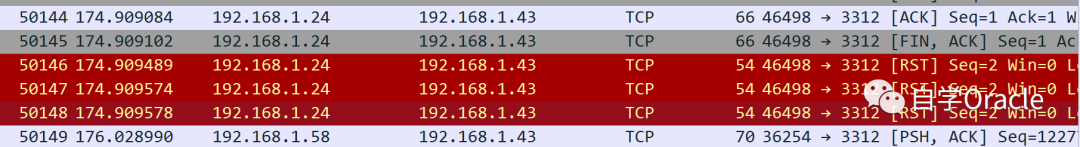 看到192.168.1.24上的包存在问题,然后在1.24上针对1.24和1.43之间抓包,同时在1.43上针对1.43和1.24之间数据抓包,然后比较抓包结果。二进制的数据,根本看不懂,没分析出来到底是什么在扫数据库端口。