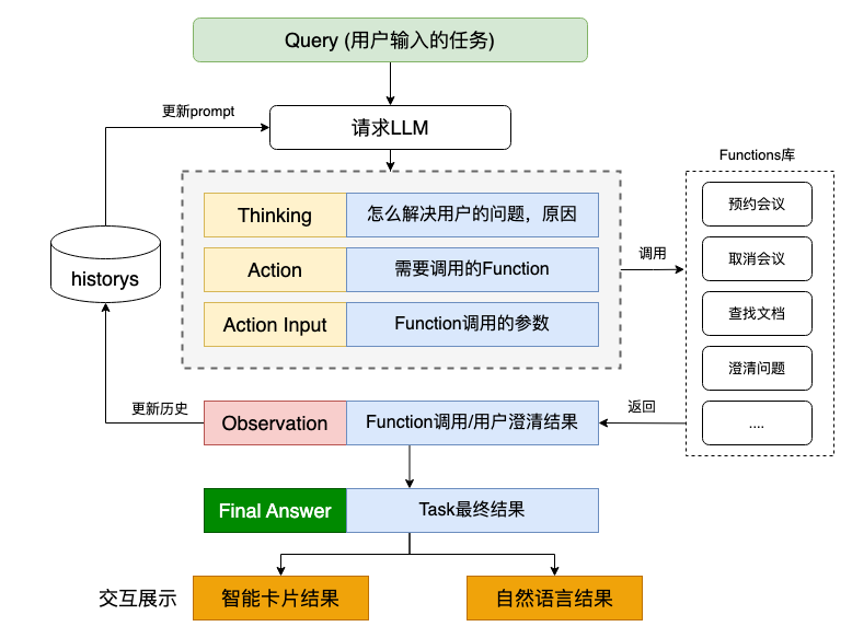 2、能力库:外挂的各种能力,比如约会议,查文档都是调用另外的系统完成。