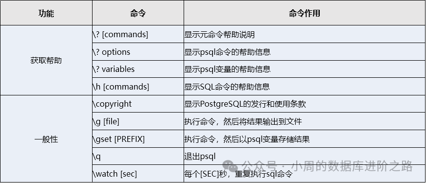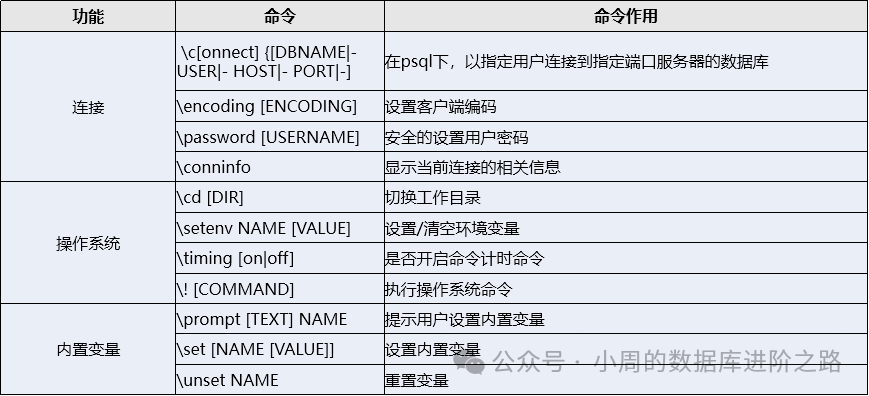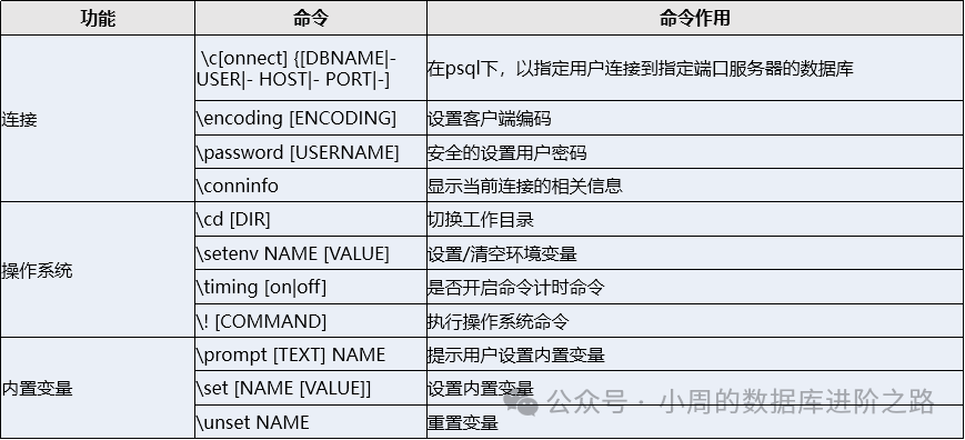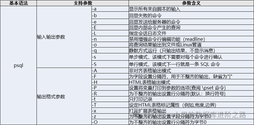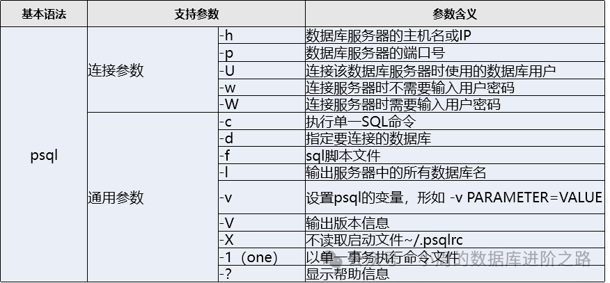 输入到psql中的任何以未加引用的反斜线开始的东西都是一个psql元命令,它们由psql自行处理;这些命令让psql对管理和编写脚本更有用;元命令常常被称作斜线或者反斜线命令;psql命令的格式是用反斜线后面直接跟上一个命令动词,然后是一些参数;参数与命令动词和其他参数之间用任意多个空白字符分隔开。