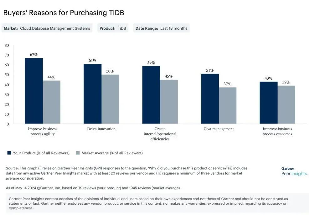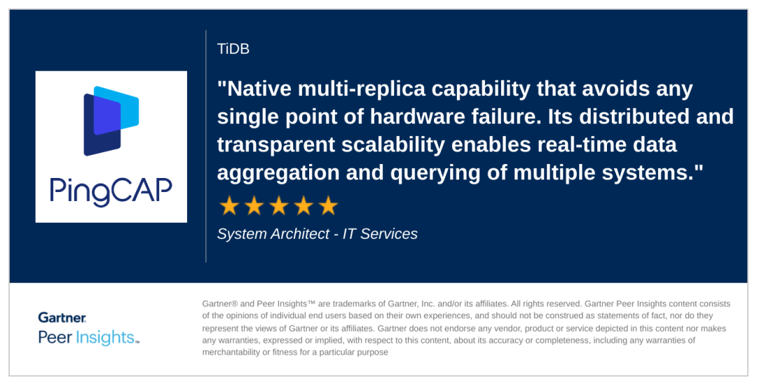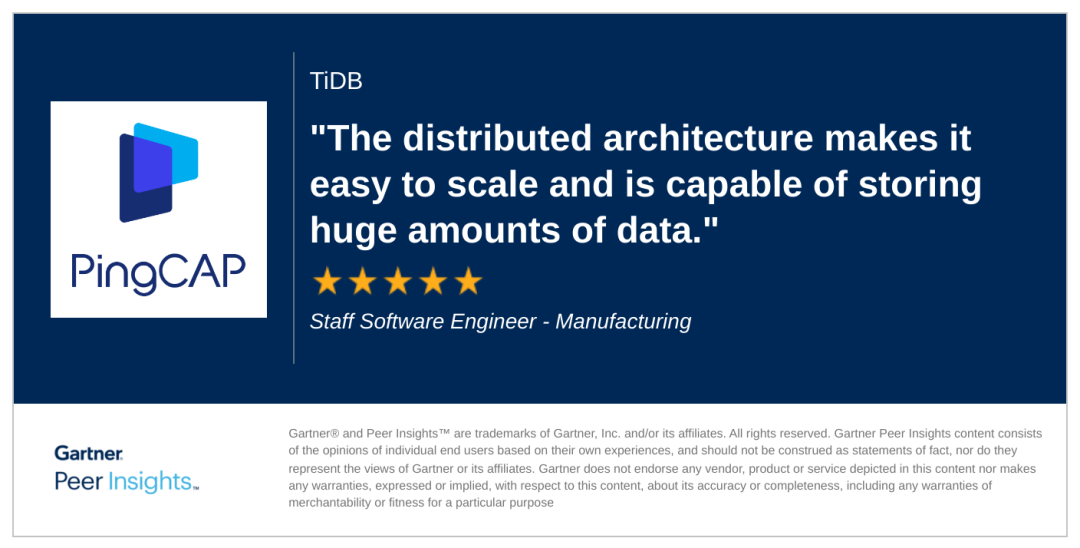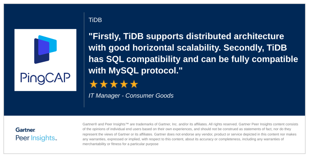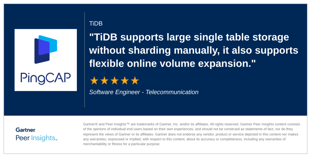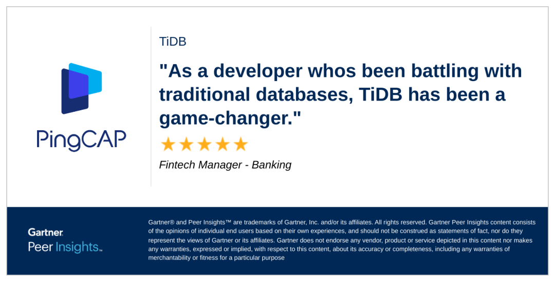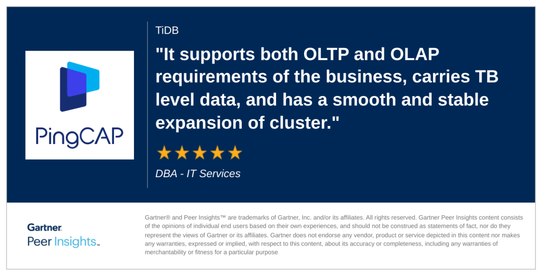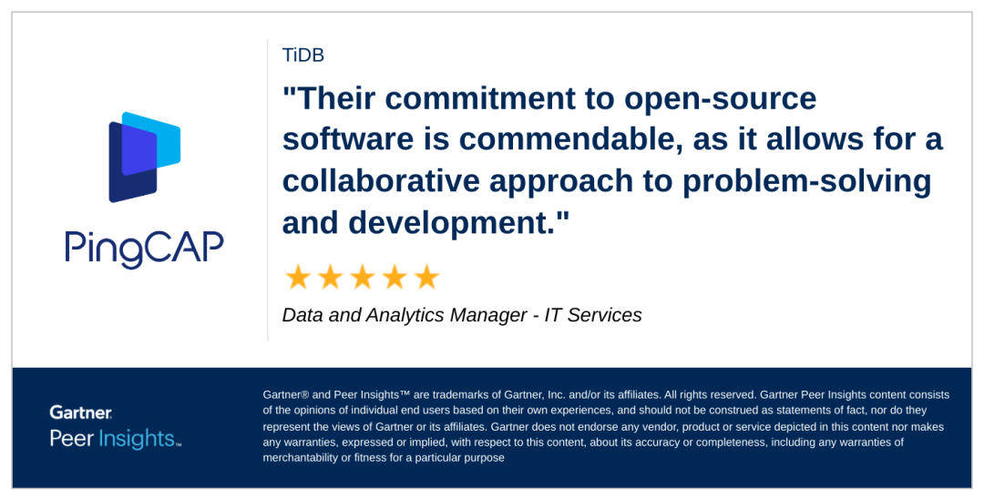 阅读更多 PingCAP 的客户评论,请访问 Gartner Peer Insights 页面