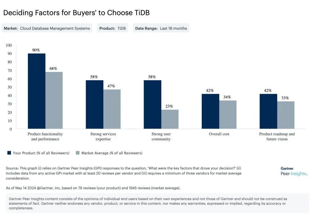 在产品功能、服务和支持、用户社区和产品未来愿景等方面,TiDB 均获得了高于市场平均水平的评分。97% 的 PingCAP 客户表示对其产品能力感到满意,并愿意推荐其解决方案。在产品功能和用户社区方面,TiDB 获得了极高的评价,分别有 68% 和 58% 的客户将这些因素作为选择 TiDB 的关键因素。