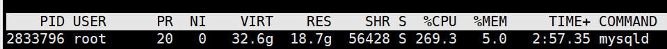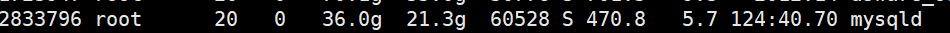 该语句执行前,通过top命令查看到的内存使用情况如下:语句执行过程中,内存持续增长,执行完毕时,其内存占用如下:执行过程中,物理内存增长了近2.6g,显然占用异常,若并发量较大的情况下,势必会OOM。