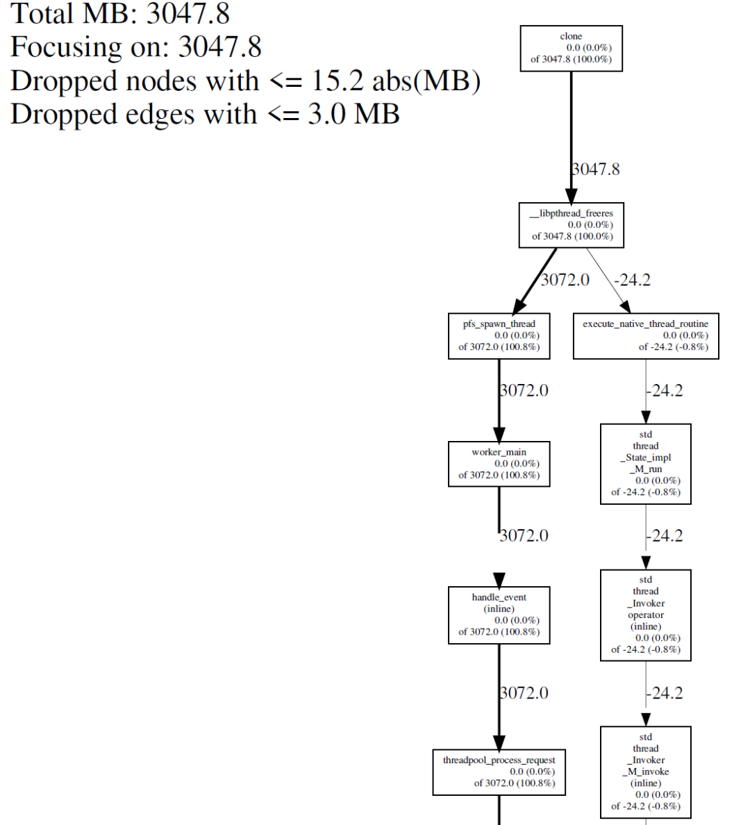 步骤四:启动进程,随后就可以在配置的prof_prefix路径下查看到生成的内存采样数据。关于jeprof结果解析的命令,这里不再赘述,具体可以通过jeprof -h查看。就本文的问题而言,实际上只需要关心从语句执行开始到语句执行结束内存的变化部分就可。那么,就可以通过如下命令对比第一次生成的profing数据以及最后一次的profling数据:/jemalloc/jeprof --pdf ./mysqld --base=log.start.heap log.end.heap > ../xxx.pdf
