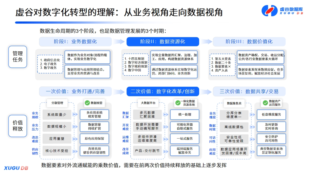具体来说,这一转型体现在数据生命周期的三个核心阶段:首先是业务数据化,即将业务运作转化为可量化的数据;其次是数据资源化,即将这些数据作为宝贵的资源进行管理和利用;最后是数据价值化,即挖掘数据的深层价值,实现数据的最大化效益。这一转型的核心,本质上是对数据库、数据平台以及数据服务的高标准要求,以确保数据的准确性、完整性和高效利用。