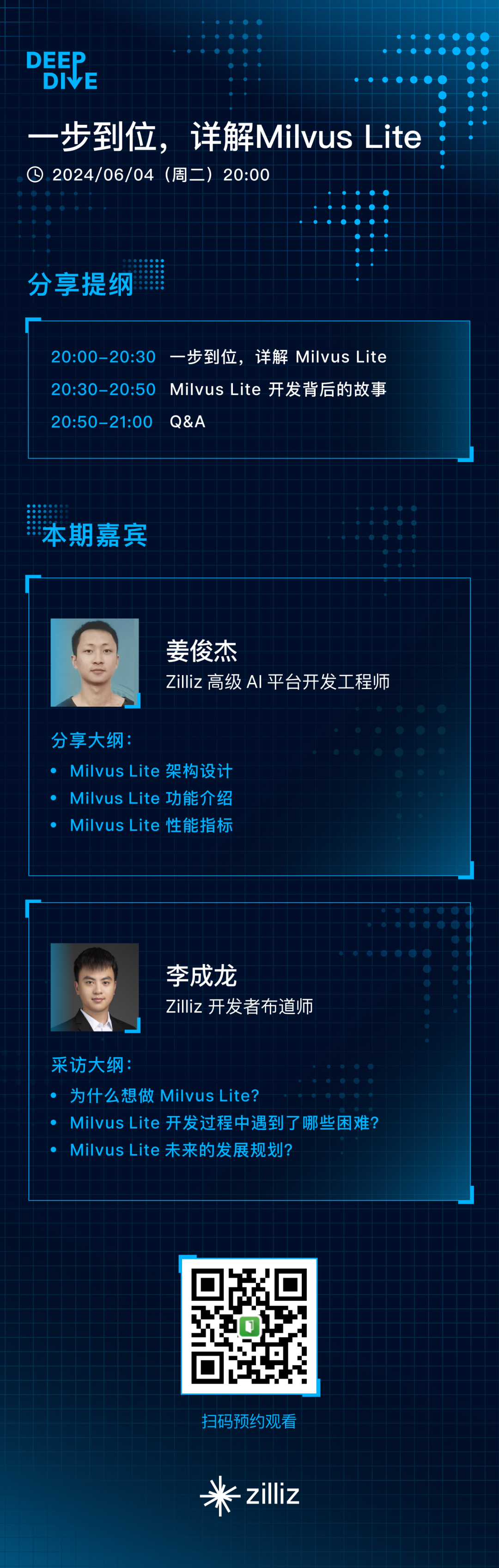 值得一提的是,Milvus Lite 与 Milvus 共享同一套 API,以确保您的客户端代码既适用于小规模的本地部署,也适用于生产环境中大规模(十亿级数据)的 Docker 或 Kubernetes 部署。为了方便大家了解 Milvus Lite,6 月 4 日(周二)晚 8 点,Zilliz 高级 AI 平台开发工程师姜俊杰将为大家在直播间详细拆解 Milvus Lite,报名地址参见(活动行链接)。