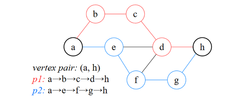 独立路径:两条简单路径,如果除了端点外没有相同的顶点,则称这两条路径相互独立。k条路径两两相互独立则称这k条路径是k条独立路径。如图所示,红色和蓝色的两条路径是a和h之间的两条独立路径。