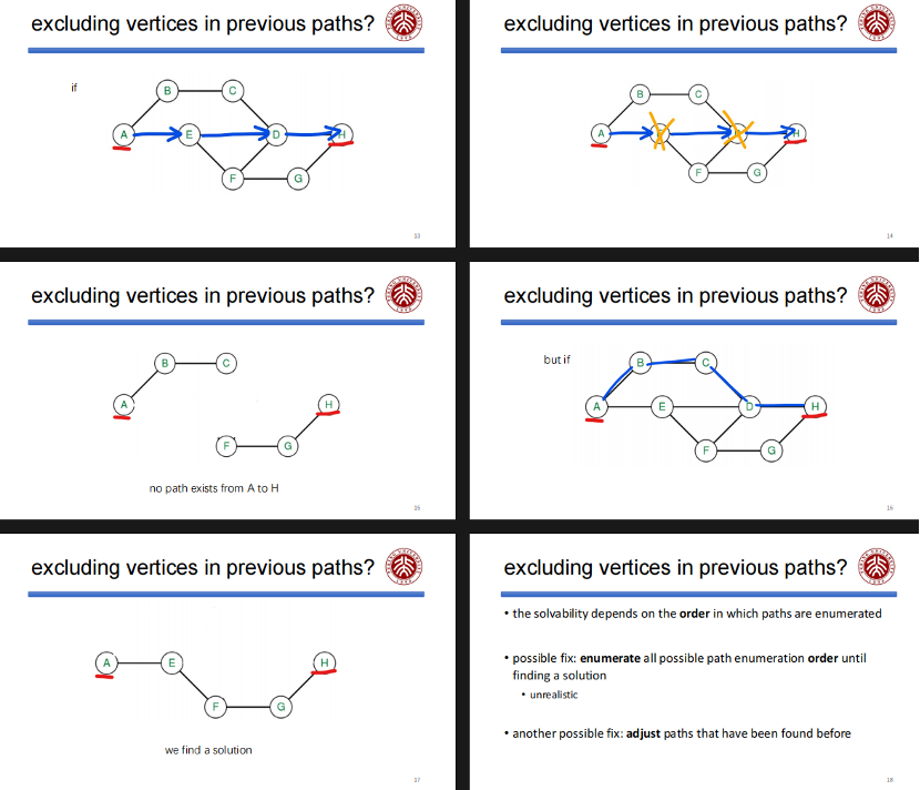 为了保证相互独立,简单地将已经用过的顶点移除掉是不高效的,比如我们找到的第一条路径是p,如果p不在任何一个k条独立路径的解中,则所有以p为第一条路径的搜索都是不必要的。
