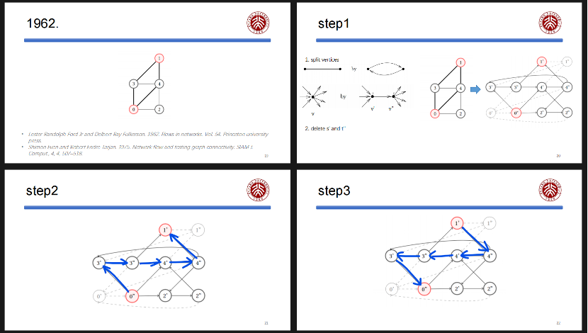 除了这一方法可以来保证路径间的独立性,另外一种方法是将顶点独立路径问题转化为边独立路径问题,然后借助最大流中增广路径的方法来确保边独立,再转化回来以确保顶点独立。