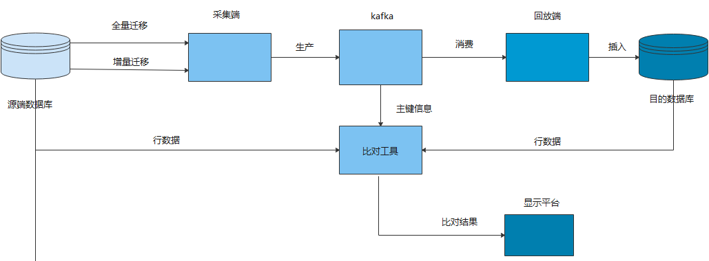 1.全量数据迁移:将源端数据库中需要迁移的表的全量数据迁移到目的数据库中,如果在全量迁移后需要做接续的增量迁移,在全量迁移的同时会采集源端数据的变化存储在kafka中,等全量迁移完成后,开始增量的同步。