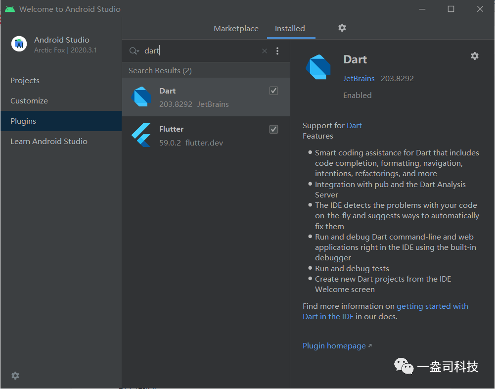 1.安装插件:搜索Dart和Flutter插件,然后安装即可。