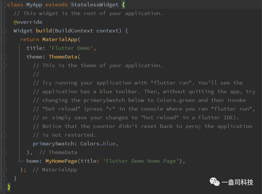 ▶对于一个Flutter应用而言,主要包括main函数,MyApp主类,然后在主类中添加其他页面展示,包括路由,语言,主题等等都可以在主类中设置。譬如,要修改标题,直接修改MyApp类build函数中的MaterialApp类中的title参数即可;修改主题,设置ThemeData相关参数即可。