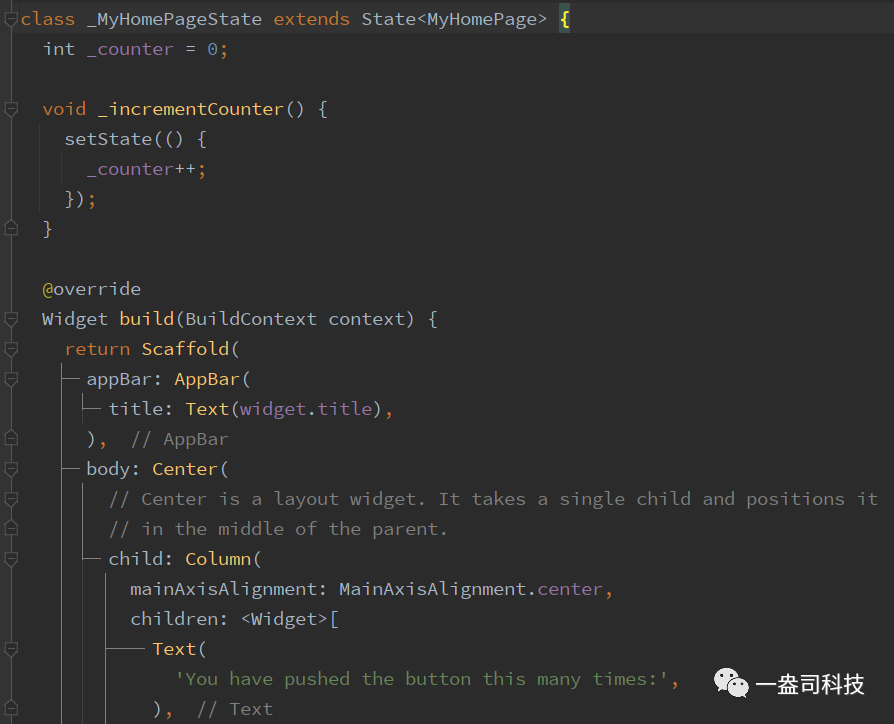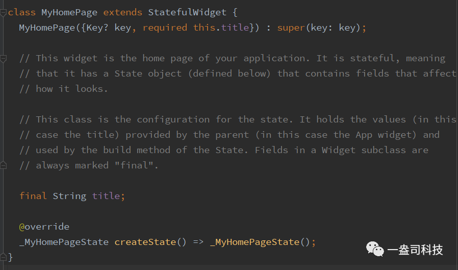 3.MyHomePage:页面组件,继承于StatefulWidget组件,即有状态组件,顾名思义是包含状态的组件。譬如,包含计数器变量,可以通过按钮点击改变其值。