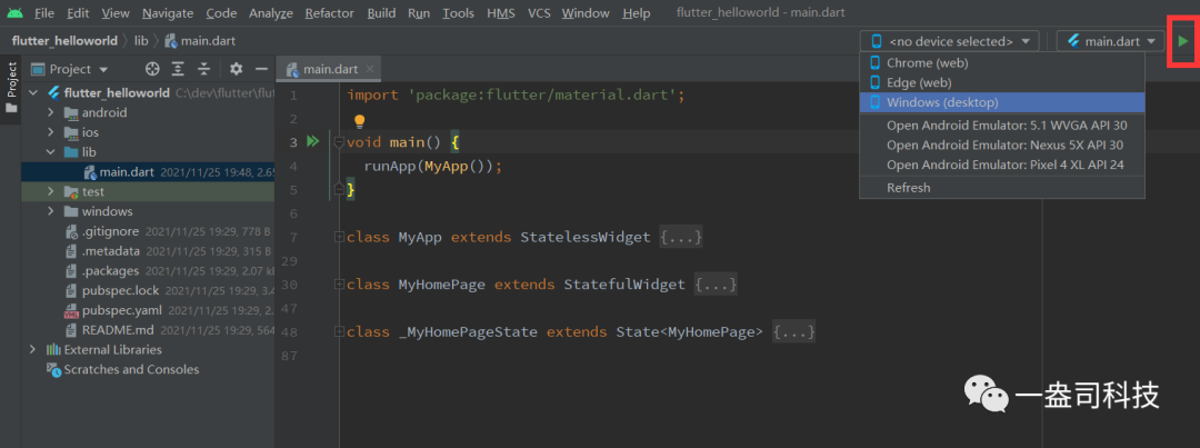 3.代码实现:工程添加完成后会自动生成示例代码,此处重点要关注的是lib文件夹下面的main.dart文件,也就是程序的主文件,当然也包括主函数main。