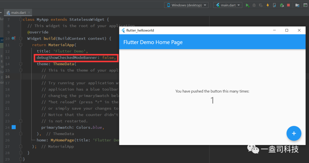▶右上角的调试提醒文本可以去掉,在MyApp类中的MaterialApp增加一个参数debugShowCheckedModeBanner,设置为false即可。