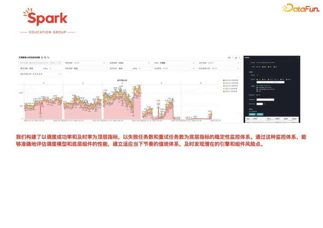 DAG 优化:首先,通过分析 Airflow 节点资源利用率,结合各类型任务 Client 执行所需的 CPU 和内存资源,合理分配整体 Pool 和 Worker Pool 的阈值,实现执行节点任务吞吐最大化。其次,由于各类型 DAG 运行周期交叉,最典型的就是天调度 DAG 与零散 DAG 的交叉,会发生调度资源、算力资源甚至 IO 资源竞抢,通过分析统计各 DAG 任务重要性和影响度,以及任务特征,合理分配各DAG 的 Pool 大小,实现整体资源利用最大化。最后,根据单 DAG 上依赖模型和各任务自身特点,动态调整各 SLA 等级的任务权重,让重依赖、重保障的任务尽早运行,从而实现更高效的任务执行。 慢任务优化:治理团队投入最大的精力就是识别优化慢 SQL,而慢 SQL 最常见的场景就是两种:(1)数据扫描量大,要么忘记加分区限制要么读取分区太多;(2)通常是嵌套 With as 较多临时查询的任务,导致解析计划中某一个或几个Reduce 卡住,但写 SQL 的人员优先满足计算口径,而忽略数据倾斜或笛卡尔问题。由于目前底层 SQL 算力引擎已弹性,故在基线保障和成本控制的背景下,优先解决慢任务是效果最佳的治理手段,也是持续保障任务平均执行效率和性能的最佳实践。 组件优化:无论是 SQL 任务或是集成任务,都会依赖其他组件,而很多时候,随着数据量或读写压力的增加,组件出现性能瓶颈,而在任务角度观察是整体运行变慢或夯死,这时候就可以通过多维分析任务运行数据,观测拐点的任务特征,结合干系组件的性能监控波动,识别并对症下药。例如:JournalNode、RDBS 以及磁盘故障等。