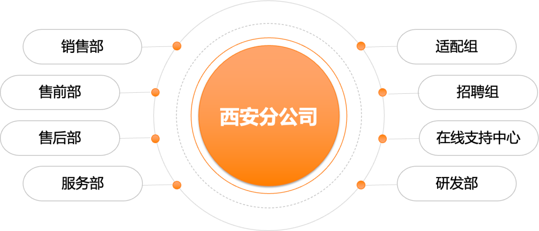 以西安为例,有销售、售前、售后、服务、适配、在线支持、研发和招聘几个部门,在背后为分公司进行业务保障和项目护航。