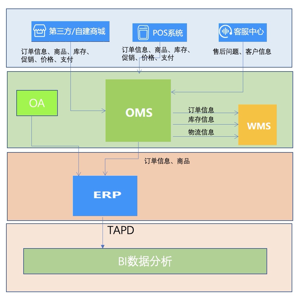 ② 覆盖系统多样:包括有赞 CRM、SCM 管理、收银、前端销售、天猫平台、京东平台、店铺小程序等多个外部系统,以及内部自建系统