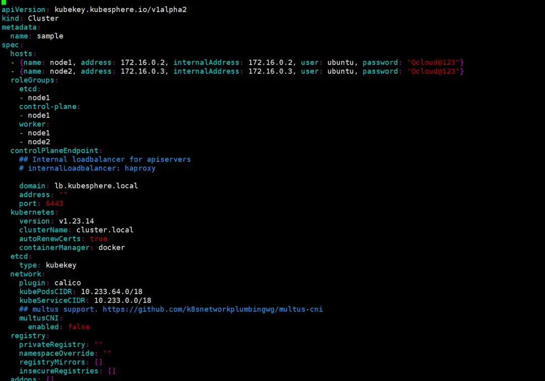 ./kk create config [--with-kubernetes version] [(-f | --filename) path]- 填入真实集群信息