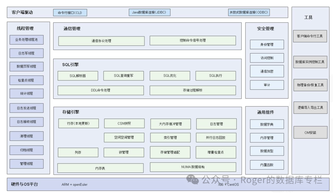 至于MogDB要说架构的话,那么属于多线程架构,我认为有点类似MySQL,具体的架构图如下: