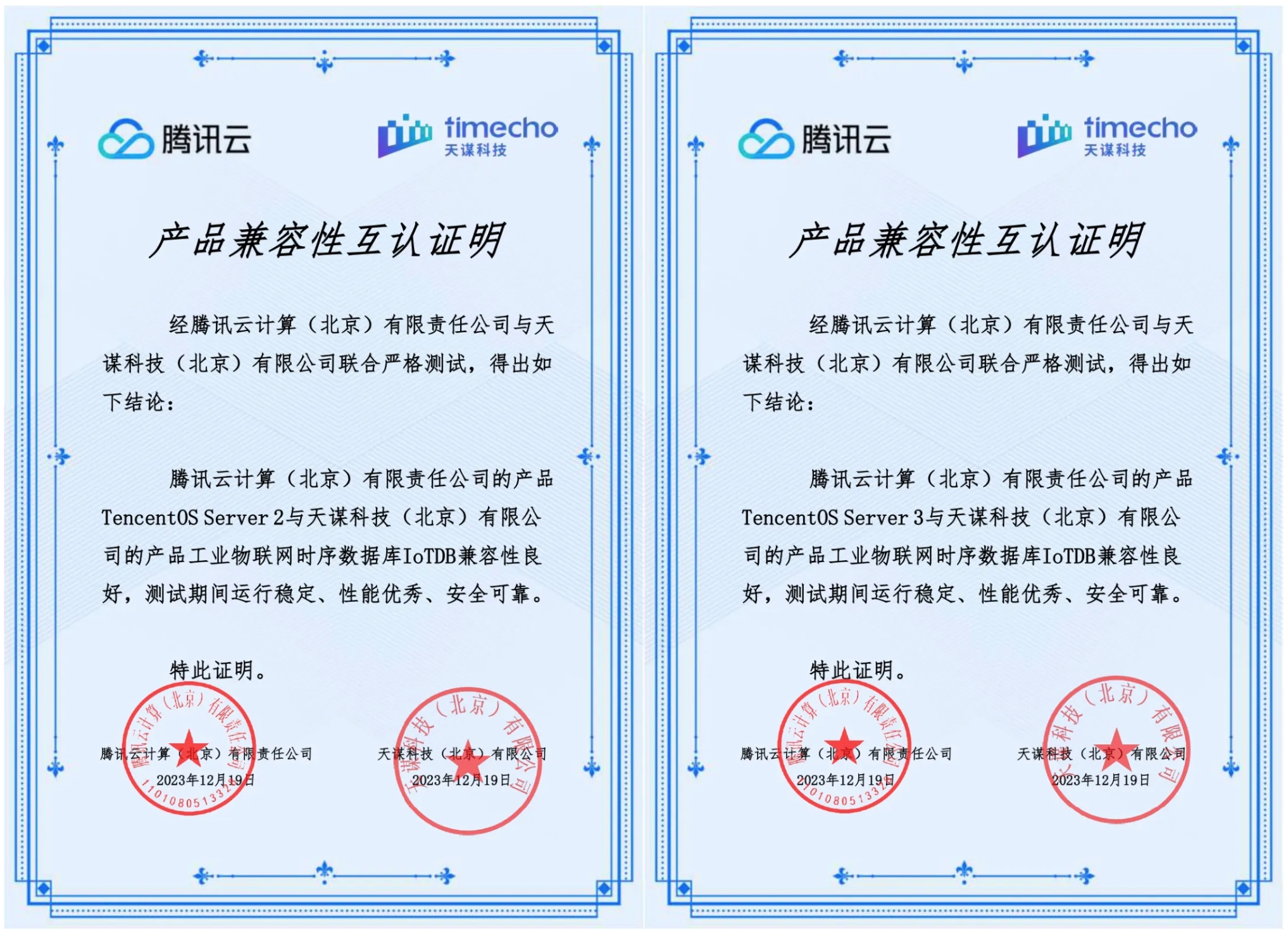 由天谋科技(北京)有限公司(以下简称天谋科技)自主研发的工业物联网时序数据库 IoTDB 顺利通过与腾讯云计算(北京)有限责任公司(以下简称腾讯云)的 TencentOS Server 2/3 的相互兼容性测试认证,并获得产品兼容性互认证明证书。经过联合严格测试,双方产品兼容性良好,测试期间运行稳定、性能优秀、安全可靠,可以满足用户对双方功能的要求。