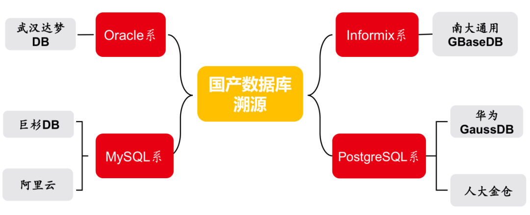 根据源代码来源不同,国产数据库可以分为四大类:Oracle 系,MySQL 系,Informix 系,PostgreSQL系。