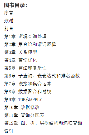 《T-SQL查询》这本主要讲述的如何提高SQL代码质量的一些内容,优化部分内容较多,对于想进一步提高SQL技能的也是非常实用的。前面3章主要是回顾上卷的核心内容,后面的章节就是一些SQL高阶技能的具体阐述了,基本涵盖了查询过程中所有可能会遇到的知识点。特别是查询优化章节写的非常好,我在工作中使用到的一些提高查询的方法大多都是来源于此。以上就是这两本书的相关介绍了,有需要的小伙伴可以网上搜索一下。