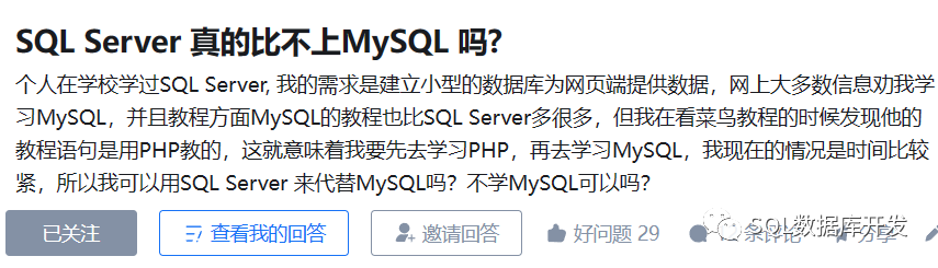 最近在网上看到一个帖子,大概意思是自己之前学过SQL Server,现在想重新学SQL,发现网上都是MySQL的教程,于是有了SQL Sever比不上MySQL的疑问。